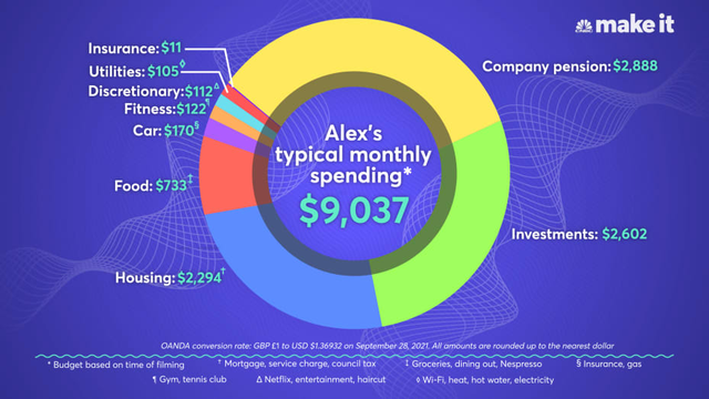 Đầu tư: Tổng cộng 2.602 USD. Trong đó phần lớn gồm 2.396 USD được chuyển vào các khoản đầu tư chịu mức thuế thấp là ISA hoặc tài khoản tiết kiệm cá nhân. Ngoài ra, Symeonoglou đóng góp 205 USD tiền lương trước thuế của mình vào tài khoản cổ phiếu công ty.