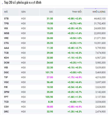 • TOP cổ phiếu Vượt đỉnh một tuần