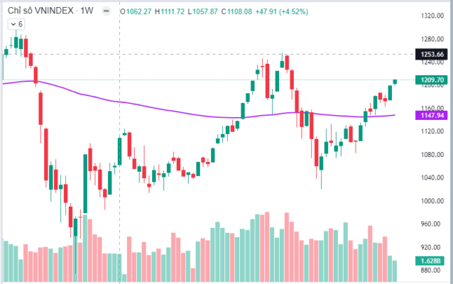Trên biểu đồ, chỉ số hình thành nến tuần Belt Hold Lines (đai tăng giá), với thân nến ngắn, kèm với thanh khoản tăng tốt tính theo phiên (tính tuần giảm do chỉ giao dịch 2 phiên), cho thấy lực cầu vào khá tốt, tuy nhiên do tâm lý đầu năm chốt lời lấy lộc đã cản đà tăng khá nhiều cho chỉ số. Vì vậy, thị trường tiếp tục xu thế tăng giá hướng đến vùng đỉnh cũ 1255, sau giai đoạn tranh chấp quanh vùng 1160-1180.