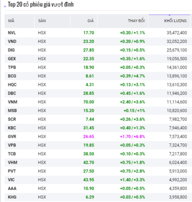 • TOP cổ phiếu Vượt đỉnh một tuần